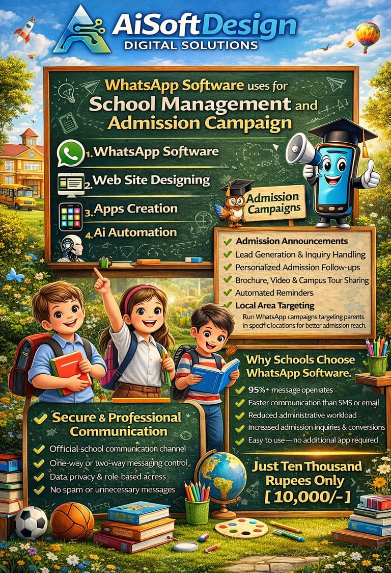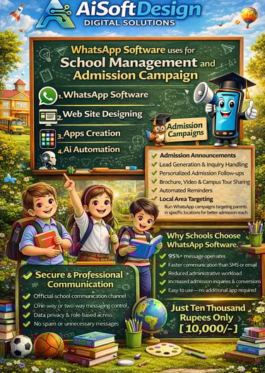 AISoftDesign builds smart ERP, CRM, apps, websites, AI automation, and WhatsApp business solutions for schools, real estate, and growing businesses.